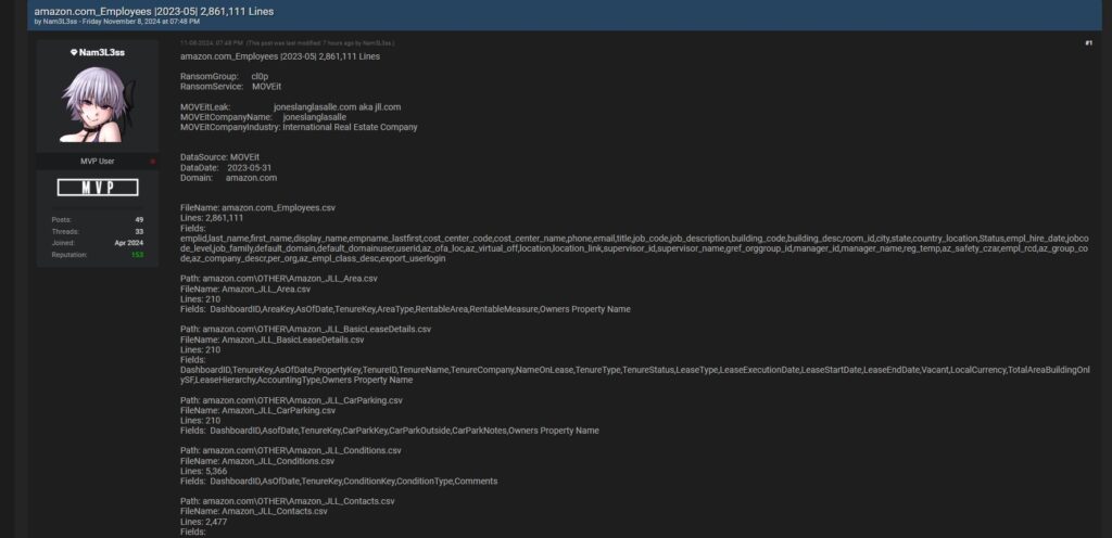 The MOVEit breach was one of the biggest breaches of 2023. Cl0p threat actors exploited vulnerabilities in the file transfer software and exfiltrated massive amounts of data from entities in all sectors. Now data from Amazon and almost three dozen other MOVEit victim entities is being leaked on BreachForums by a forum user calling themself “Nam3l3ss.”