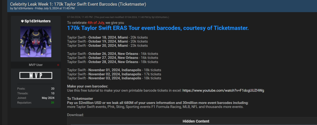 Hackers have leaked what they claim is Ticketmaster barcode data for 166,000 Taylor Swift Eras Tour tickets, warning that more events would be leaked if a $2 million extortion demand is not paid.
