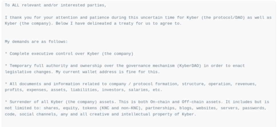 In the onchain encoded message, the hacker has stated several demands as a part of the settlement and asked to be granted temporary authority and full ownership over KyberDAO “in order to enact legislative changes.”