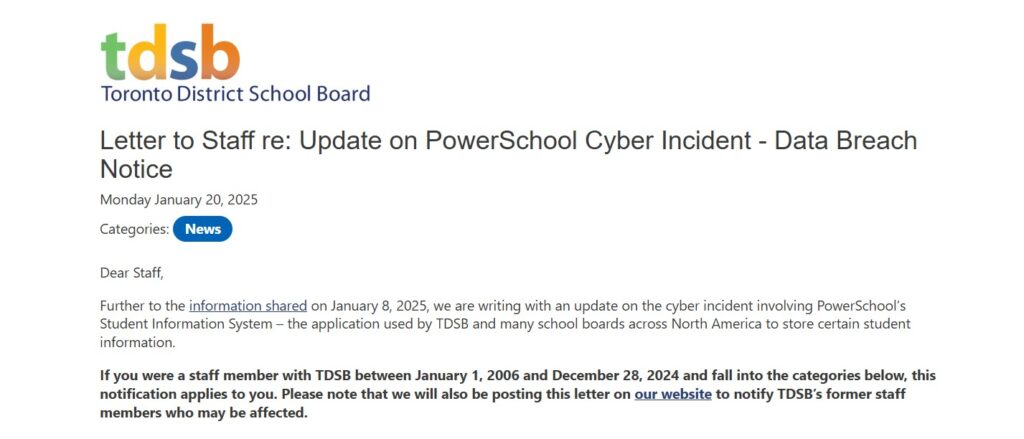 While a bright light will continue to be shined on PowerSchool, maybe some Canadian will ask TDSB why they had so much old data still connected to the internet instead of segmented and encrypted. The breach is undoubtedly PowerSchool’s fault and responsibility, but could the district have protected student data better? Hopefully the privacy commissioner will look at that, too.